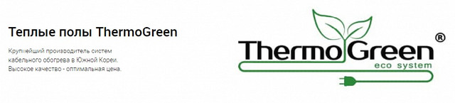 «ThermoGreen» - Південно-корейський виробник продуктів для теплої підлоги входить в корпорациию Green Industry. Розробляє і виробляє продукти електроопалення, екологічно чисті для людського організму.